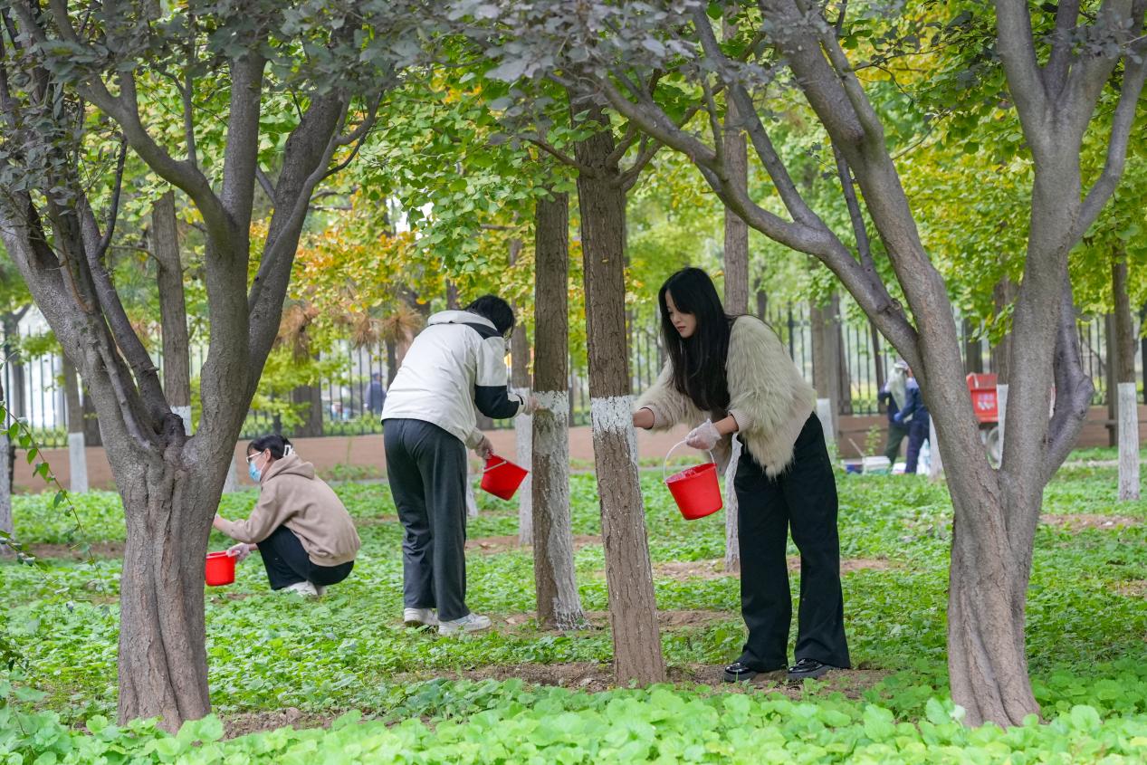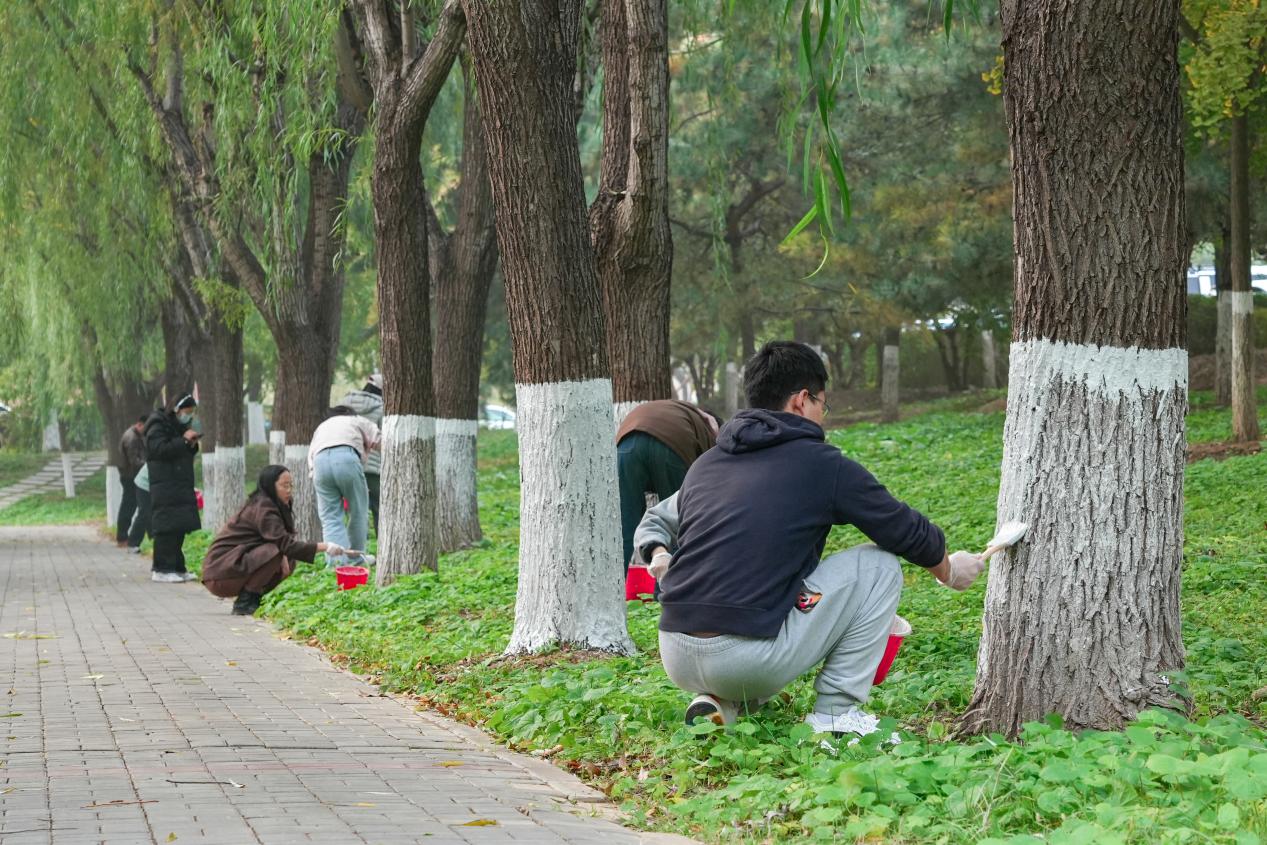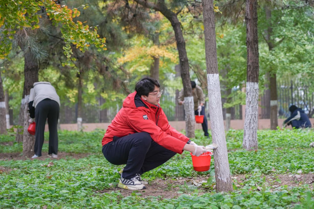 在行政楼南侧小花园里,党员发展对象的同学们又化身“树木守护者”。在后勤处王光亮老师的组织安排下,将参与活动的60余名同学分成三组,前往花园指定区域,拎起装有涂白剂的小桶,手持毛刷认真涂抹,从树干基部到一米高的位置,层层递进,均匀涂抹。忙碌的身影、洁白的树干与秋日花园相映成景。