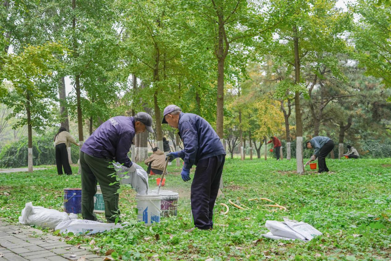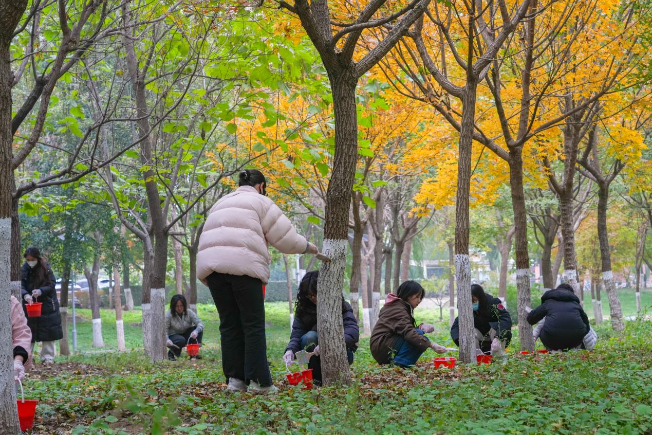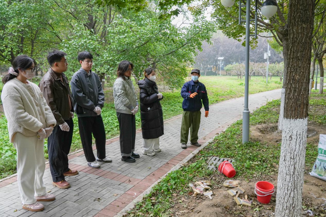 在行政楼南侧小花园里,党员发展对象的同学们又化身“树木守护者”。在后勤处王光亮老师的组织安排下,将参与活动的60余名同学分成三组,前往花园指定区域,拎起装有涂白剂的小桶,手持毛刷认真涂抹,从树干基部到一米高的位置,层层递进,均匀涂抹。忙碌的身影、洁白的树干与秋日花园相映成景。