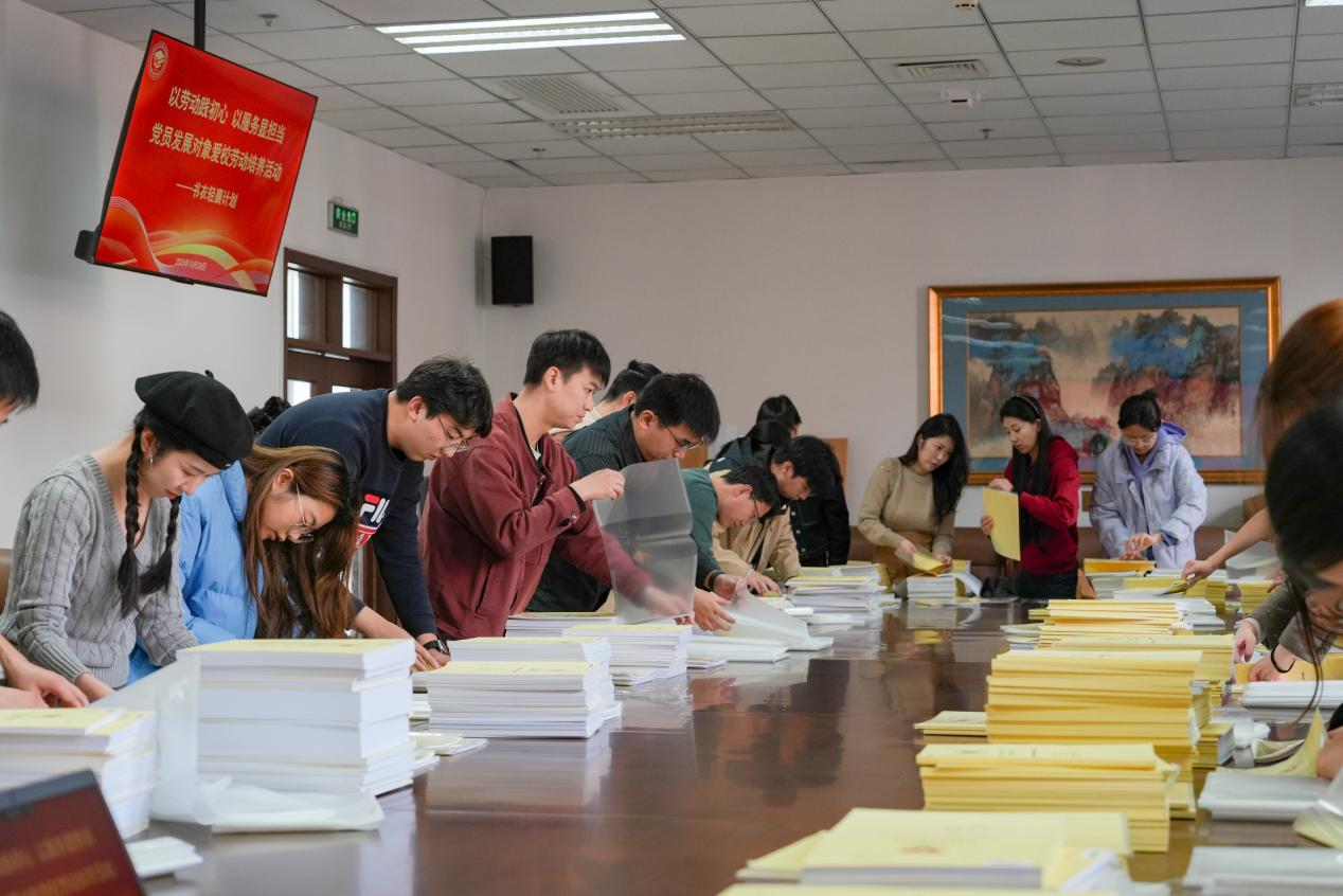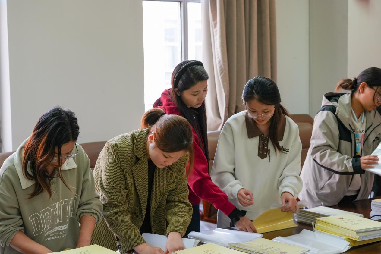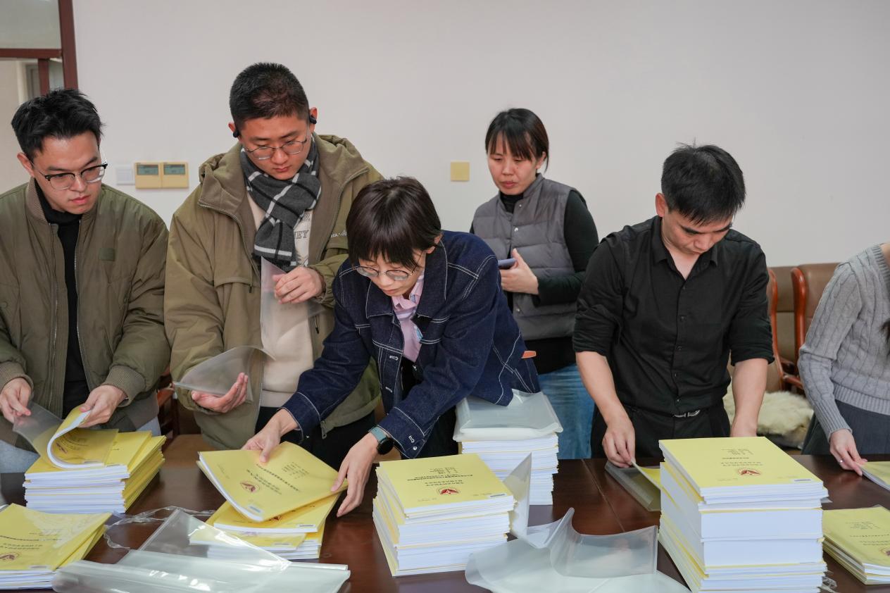 书衣轻裹活动在图书馆多位老师的筹备协调与悉心组织下有序开展。活动伊始,副馆长田杰动员讲话,寄语党员发展对象在实践中锤炼担当,以实干践行爱校情怀;副馆长杨乐、读者服务部杨佳以及学习支持部王蕾为活动开展提供全程技术指导;资源建设部赵敏进行详细培训并现场亲自演示。活动开始后,同学们精准套封论文封皮,熟练折叠、粘贴,将一张张透明朴素的封皮化为毕业论文的“防护铠甲”。针对1800册论文资料,大家以精益求精的态度耐心处理,指尖流传间尽显认真与担当。