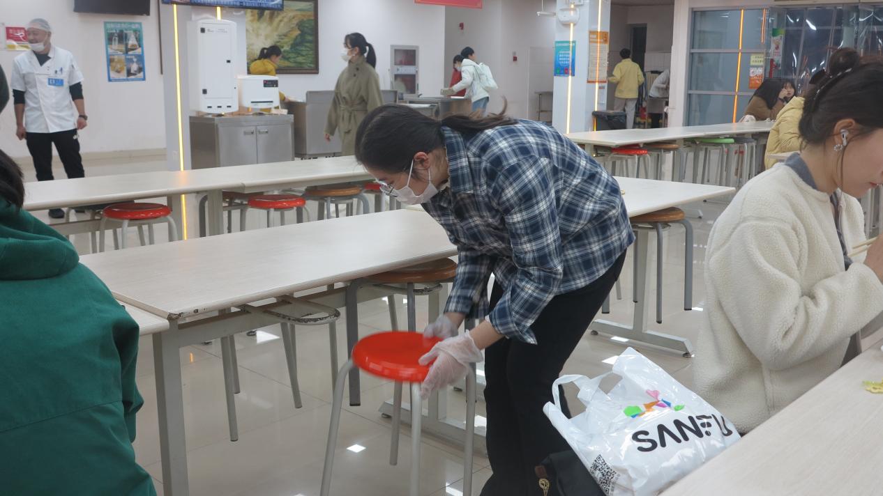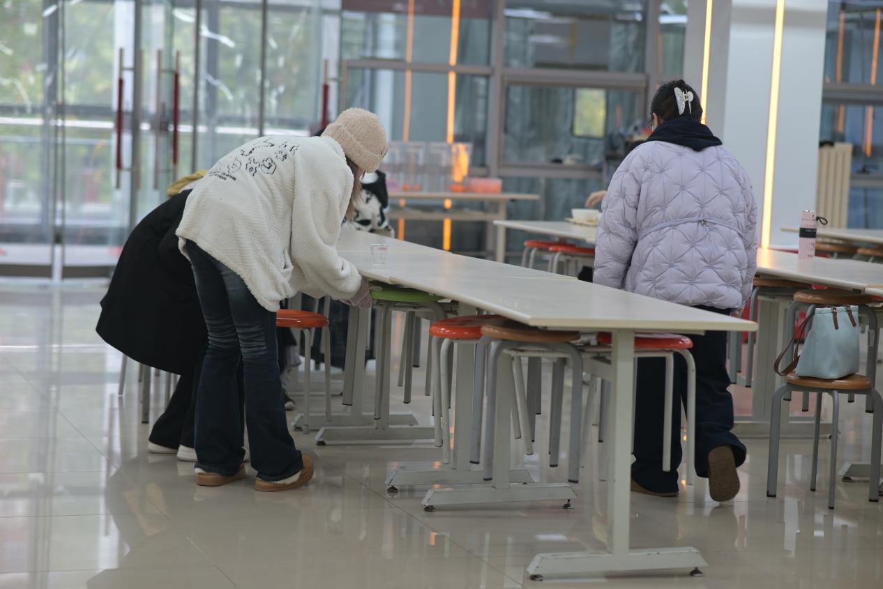 校园“食”光服务由后勤处王利、王杰两位老师全程协调安排。在学生用餐时,同学们俯身将散落在餐桌周围的凳子逐一拾起,对准桌钩精准摆放,确保每把凳子紧贴桌面、排列整齐。看似简单的“凳子套桌”归位工作,大家却丝毫不马虎,用耐心和细心让食堂焕然一新,为同学们营造了整洁有序的就餐环境。